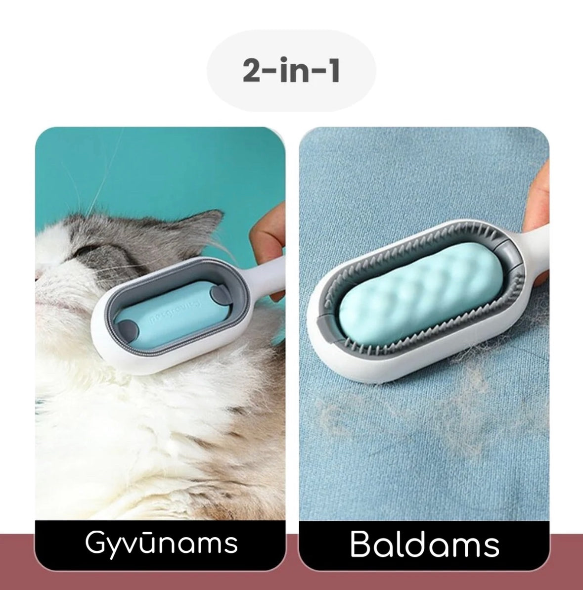 ✔ Drabužių plaukų šalinimo priemonė - šukų gale yra trumpi. smulkūs dantukai. kuriais galima pašalinti palaidus augintinio plaukus nuo drabužių ir baldų.