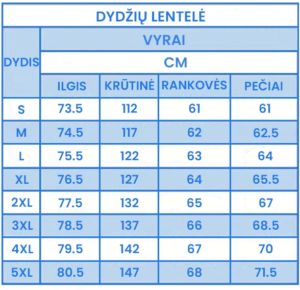 - Vidutinio ilgio striukė izoliuoja šilumą ir nepraleidžia šalčio. Puikiai tinka žiemos sezonui. Ypatingai šiltas ir tvirtas striukės audinys užtikrina kokybę, patvarumą ir ilgaamžiškumą. Didelis kapišonas apsaugos galvą, ausis ir veidą nuo žiemos speigo.