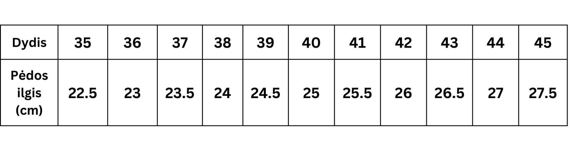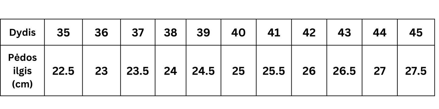 Priežiūros rekomendacijos: rekomenduojame naudoti švelnias valymo priemones, kad išsaugotumėte batų išvaizdą ir kokybę.