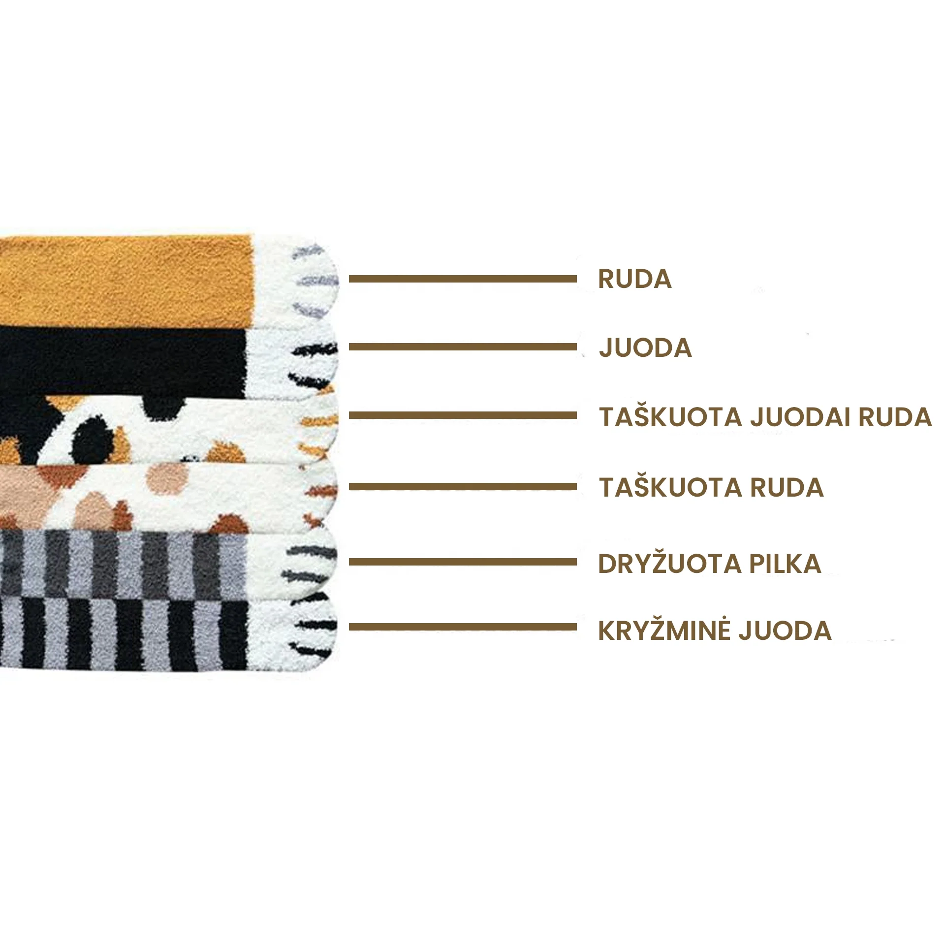 - Rinkinio spalvos: Kryžminė juoda, Dryžuota pilka, Taškuota rudai juoda, Taškuota juoda, Juoda, Ruda.