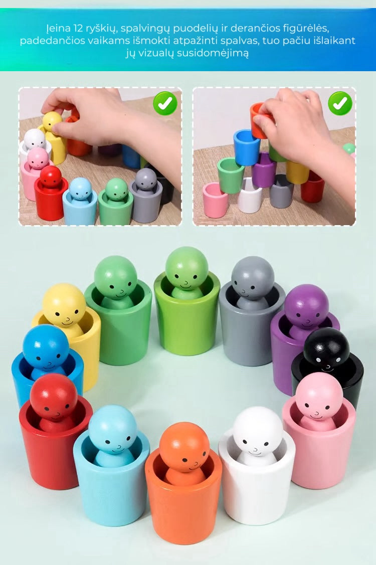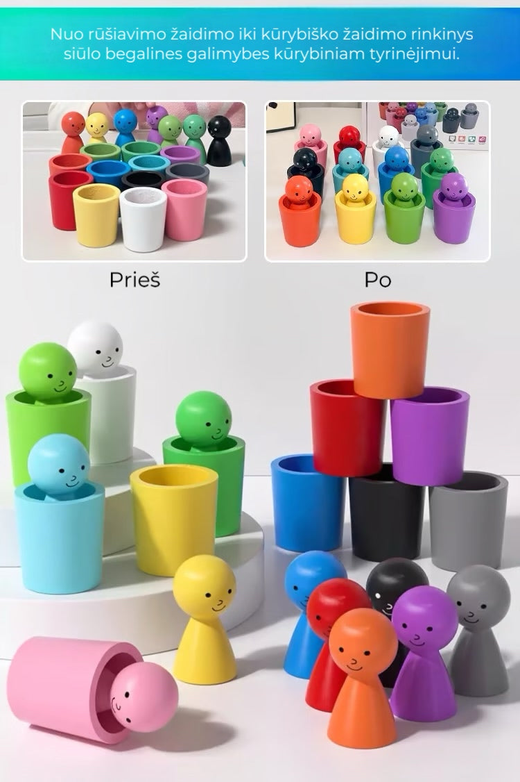 🎨 Spalvingas dizainas: Ryškūs įvairių spalvų puodeliai sudomina ir stimuliuoja vaikų regos pojūčius.