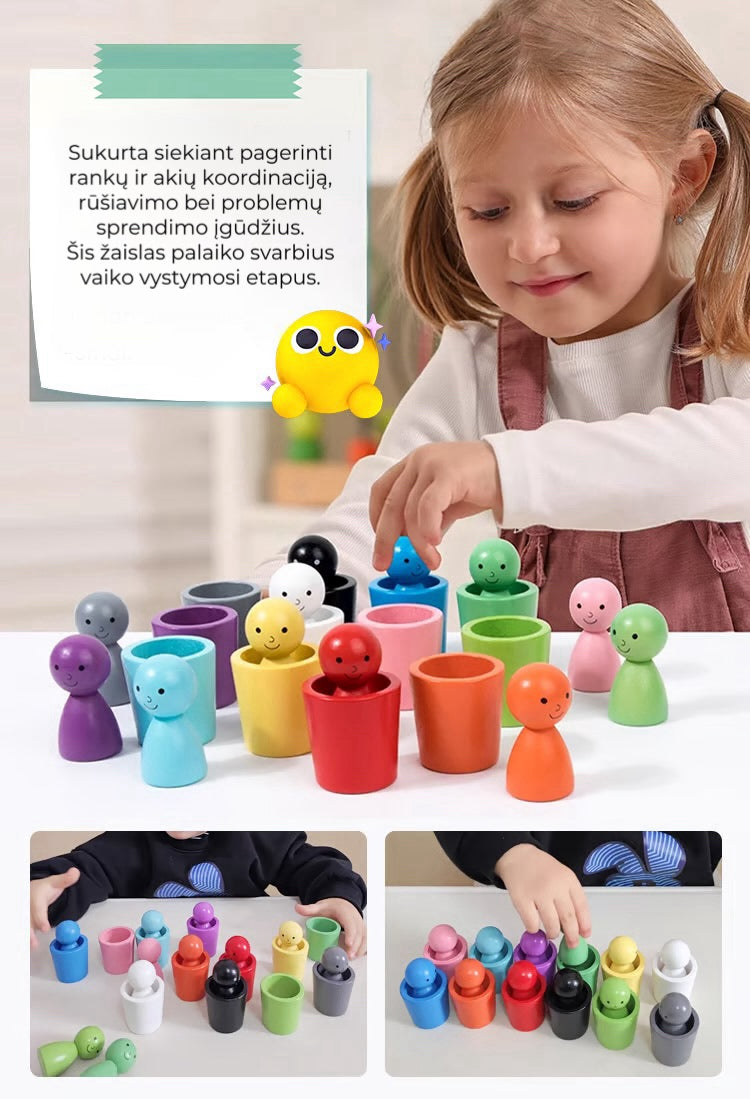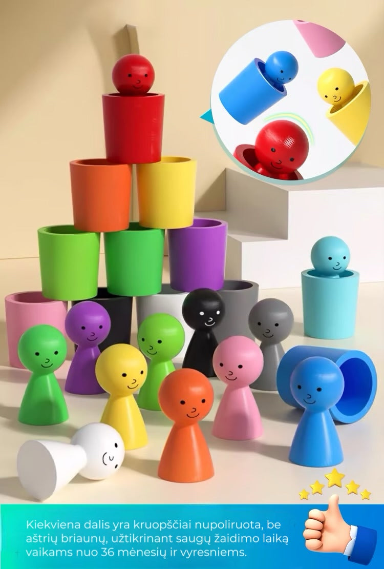 🧠 Kognityvinis vystymasis: padeda mažyliams lavinti spalvų atpažinimo, rūšiavimo įgūdžius ir rankų-akių koordinaciją.
