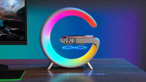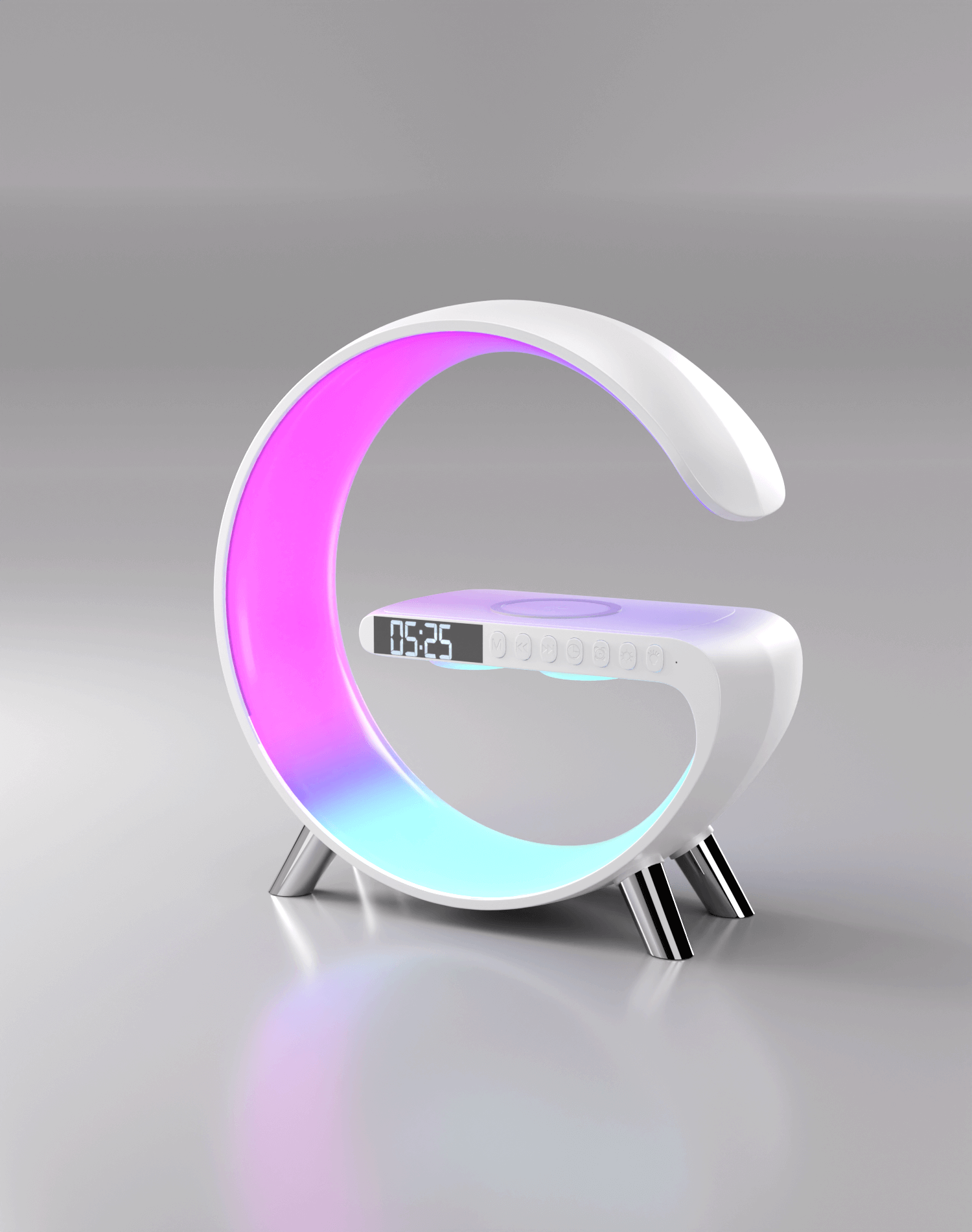 G raidės belaidžio įkrovimo žadintuvas ir stalo šviestuvas