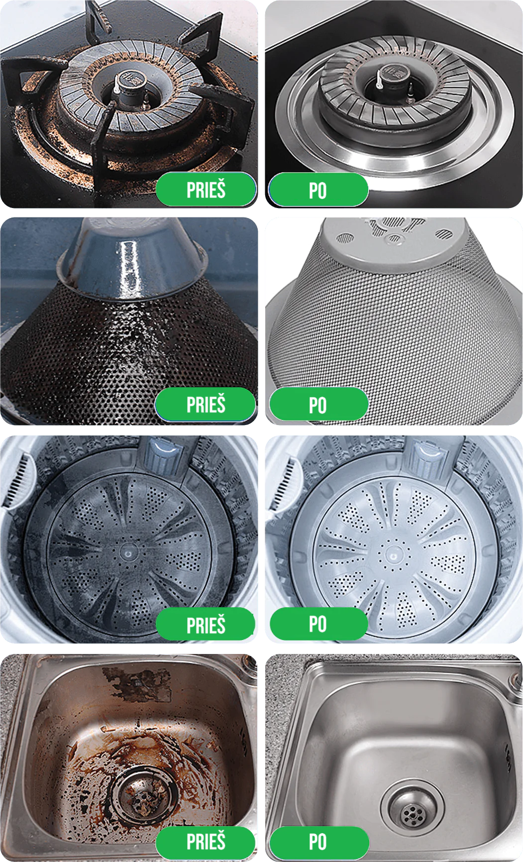 Pašalina rūdžius. riebalus. rūdžius ir senas dėmes.