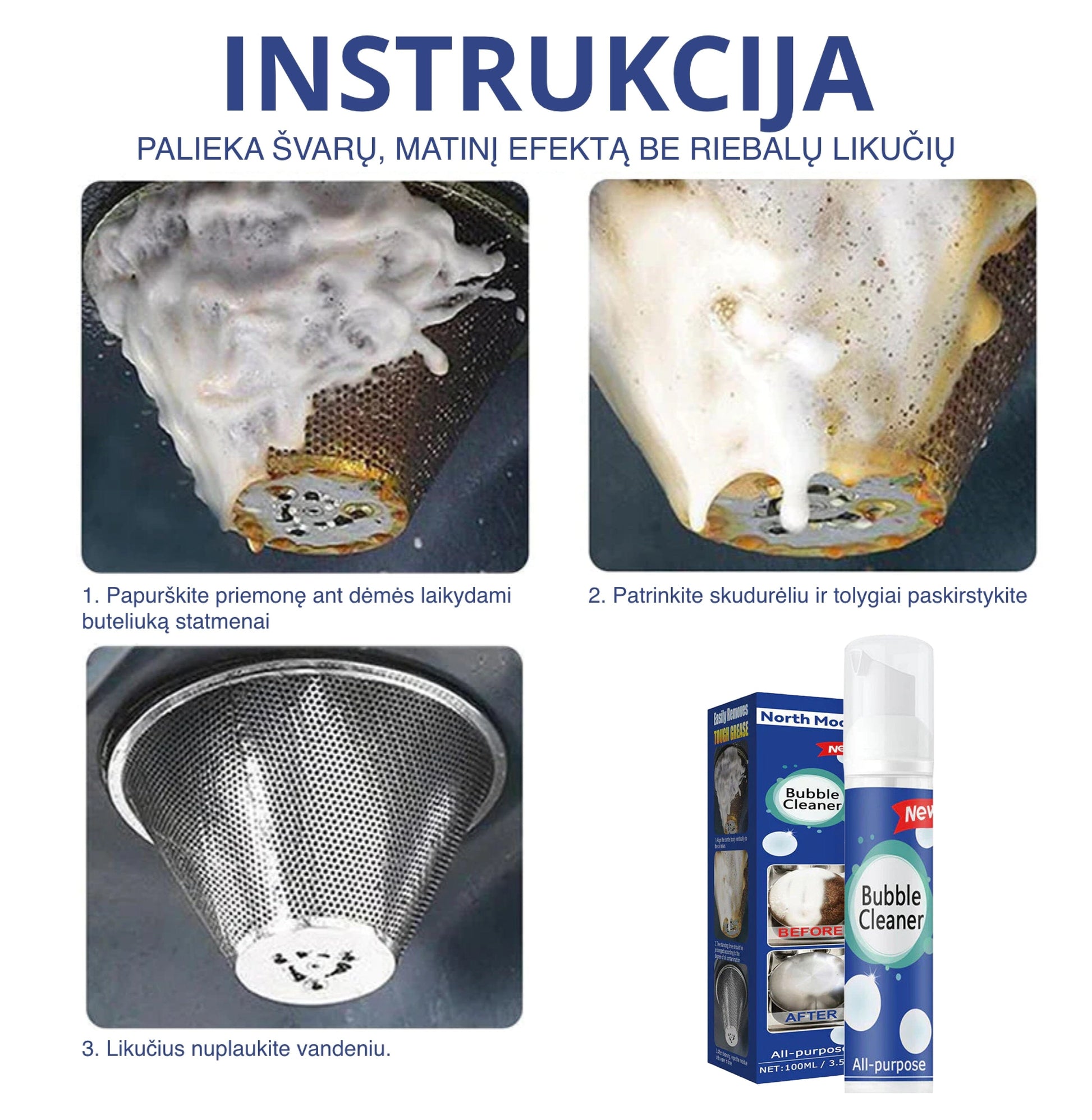 Pristatome All-purpose Bubble Cleaner - valymo sprendimą, kuris toks efektyvus, jog manoma, kad jame yra žiupsnelis magijos! Praėjo tie laikai, kai nešvarumų šveitimas prilygo sporto treniruotei, nes naudoti mūsų universalų namų valiklį tai lyg mojuoti stebuklinga lazdele ir stebėti, kaip nešvarumai išnyksta savaime.