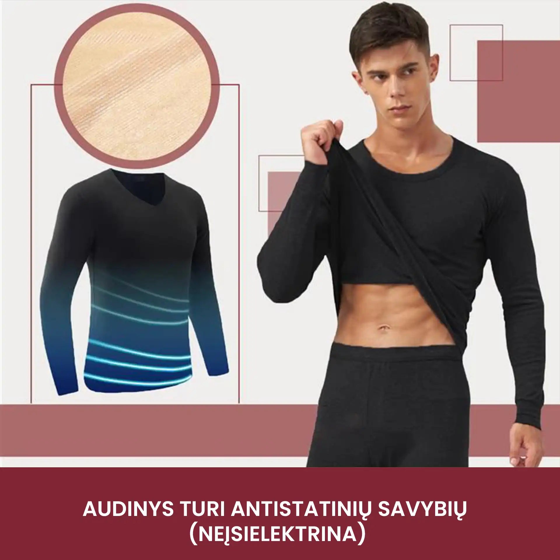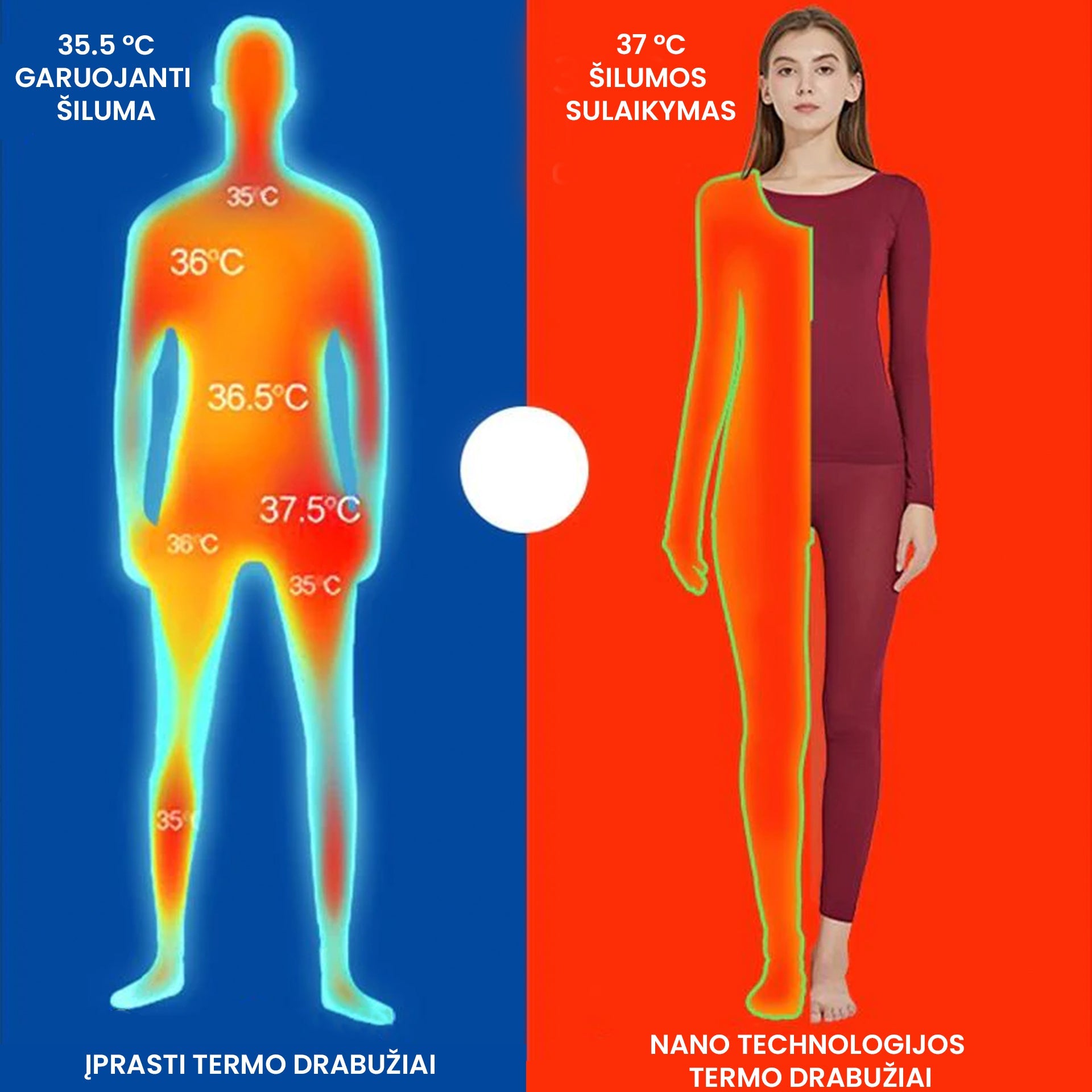 - Kvėpuojantis drabužių audinys, kuris pasižymi ypatingu šilumos sulaikymu šaltuoju metų laikotarpiu. Termo drabužių technologija išlaiko, net 65 % daugiau šilumos nei įprasti apatiniai drabužiai. Jauskitės šiltai, laisvai ir komfortiškai!