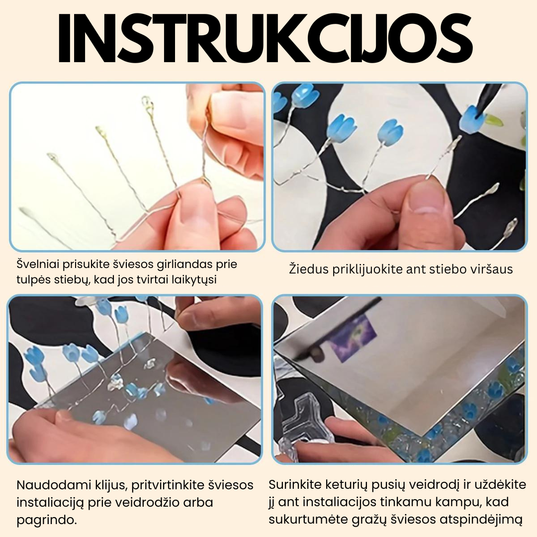 Kai įjungiate šviesą, veidrodis atskleidžia nuostabią švytinčių tulpių instaliaciją, kuri suteiks jūsų erdvei natūralumo ir elegancijos. Kiekviena detalė sukurta tam, kad būtų paprasta ir smagu susikurti savo tulpių šviesos dėžutę.