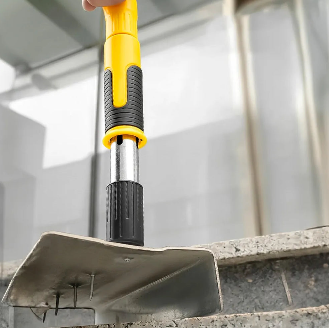 Taip, šis įrankis yra pagamintas iš tvirto metalo ir gali būti naudojamas tokioms medžiagoms kaip plytos, betonas ir storos medinės lentos.