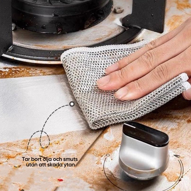 GALINGAS VALYMO EFEKTAS:Šluostėje naudojama pažangi audimo technologija su rombo formos tinklelio raštais ir aukštos kokybės metalinės vielos medžiaga. todėl lengva pašalinti rūdis. aliejaus dėmes. įsisenėjusius pelėsius ir t. t. Ji nekenkia nei keptuvei. nei jūsų rankoms. Tai puikus pagalbininkas jūsų virtuvėje.