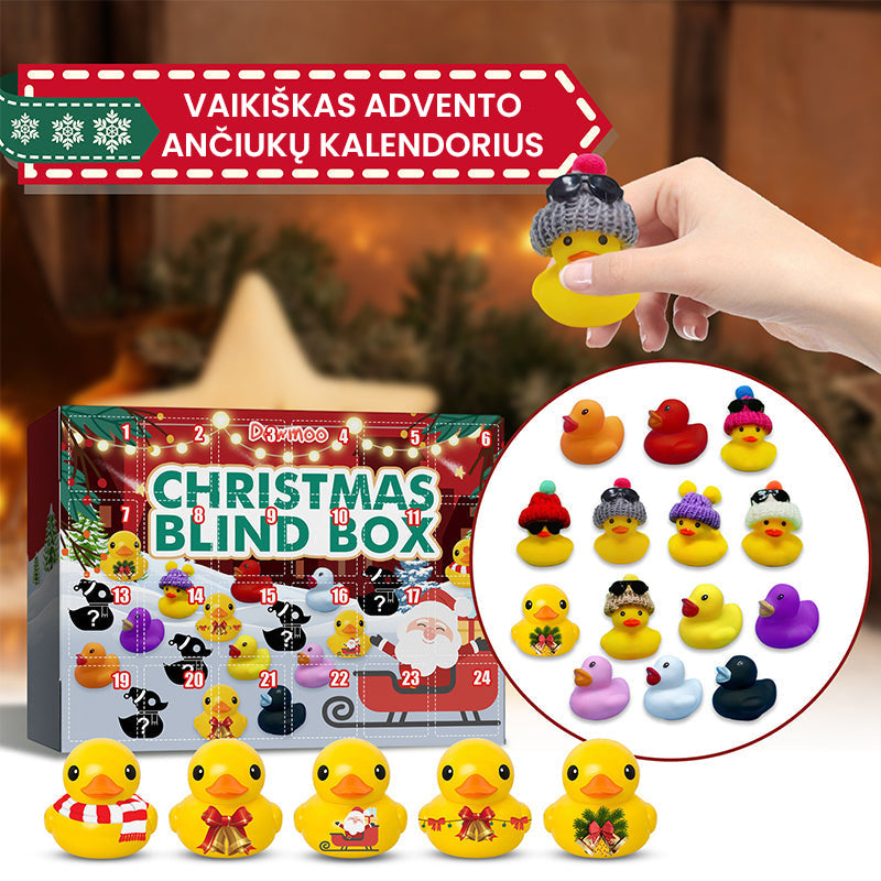 - Advento ančiukų kalendorius yra puiki dovana vaikams, kurie ypatingai laukia Kalėdų bei dovanų! Kalendorius išsiskiria tuo, jog čia nėra saldainių, bet atidarius kiekvienos dienos langelį rasite linksmus, išskirtinius ančiukus, kurie pradžiugins kiekvieną vaiką!