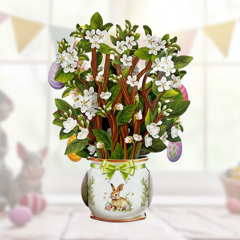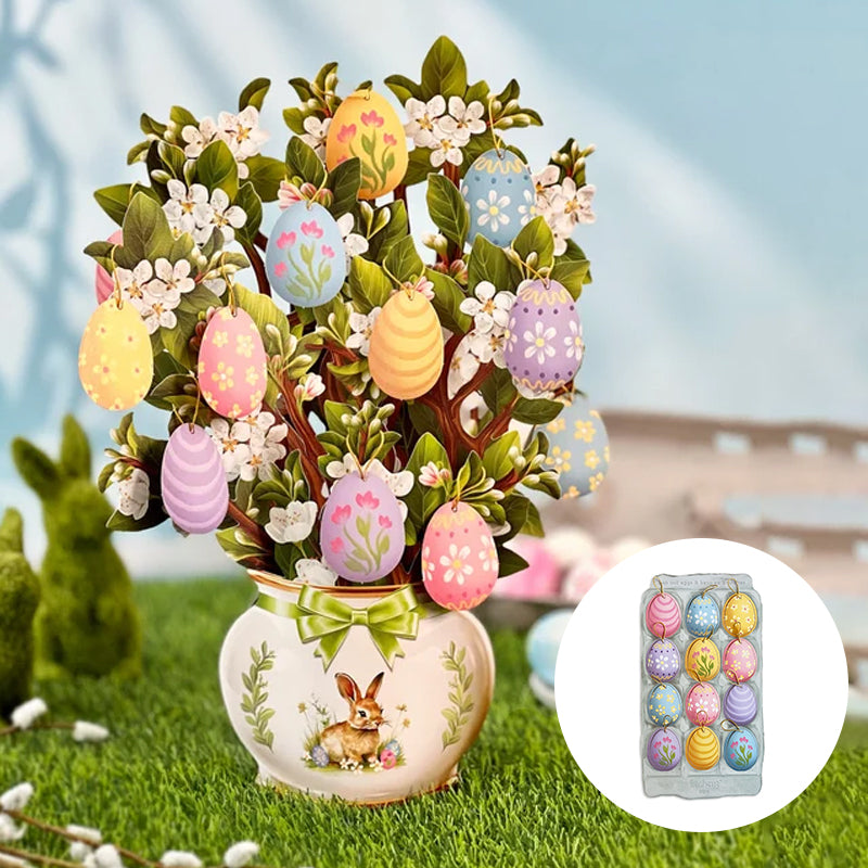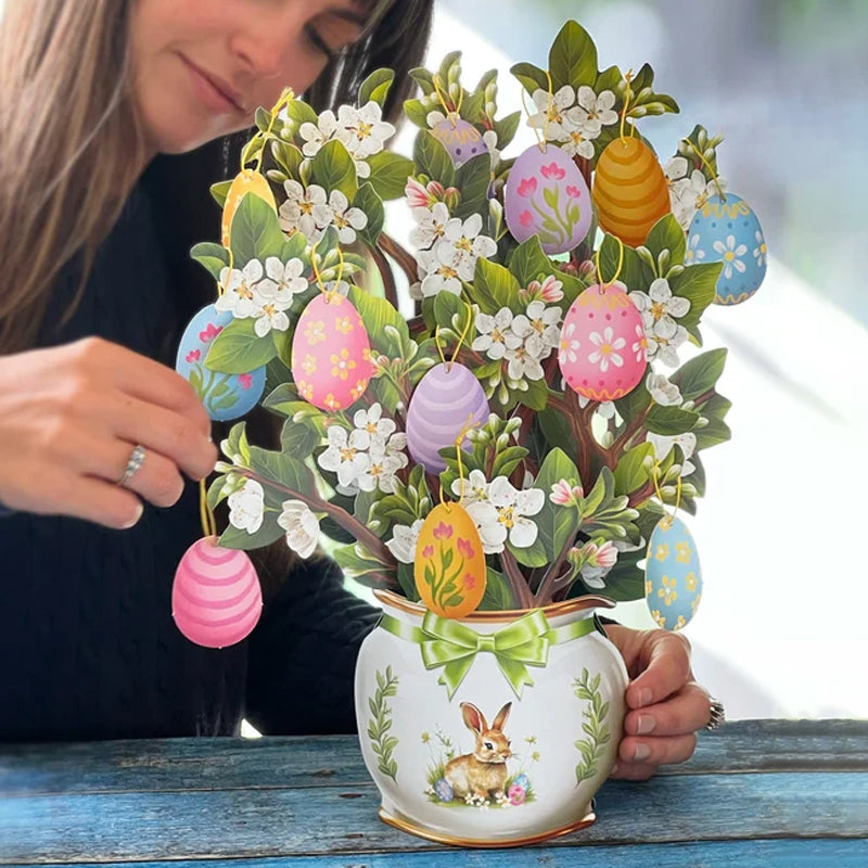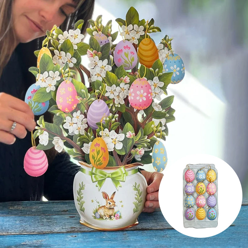 - Velykinė puokštė yra lengvai išlankstoma ir pastatoma ant lygaus paviršiaus - stalo ar lentynos. Pakuotėje yra margučiai, kuriais galėsite papuošti velykinį medelį!