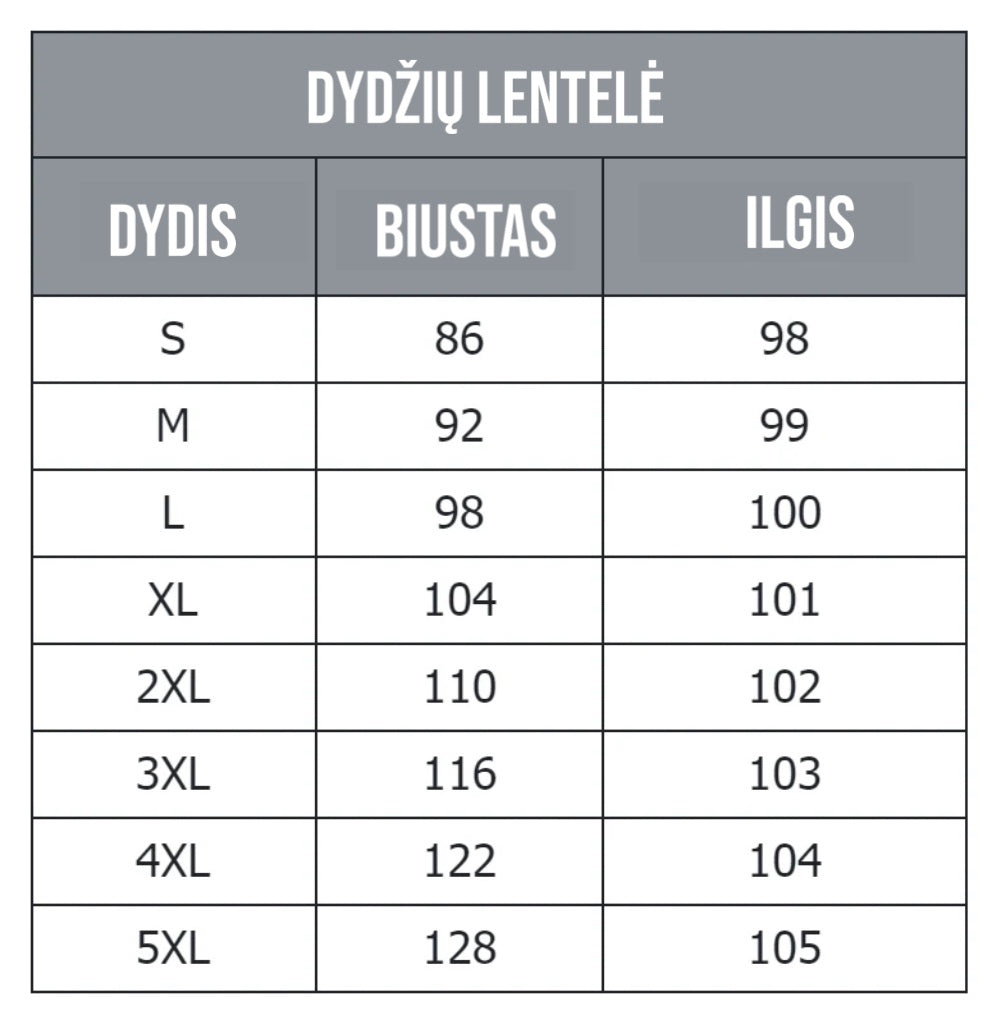 | Dydis | Krūtinės apimtis (cm) | Liemens apimtis (cm) | Klubų apimtis (cm) |