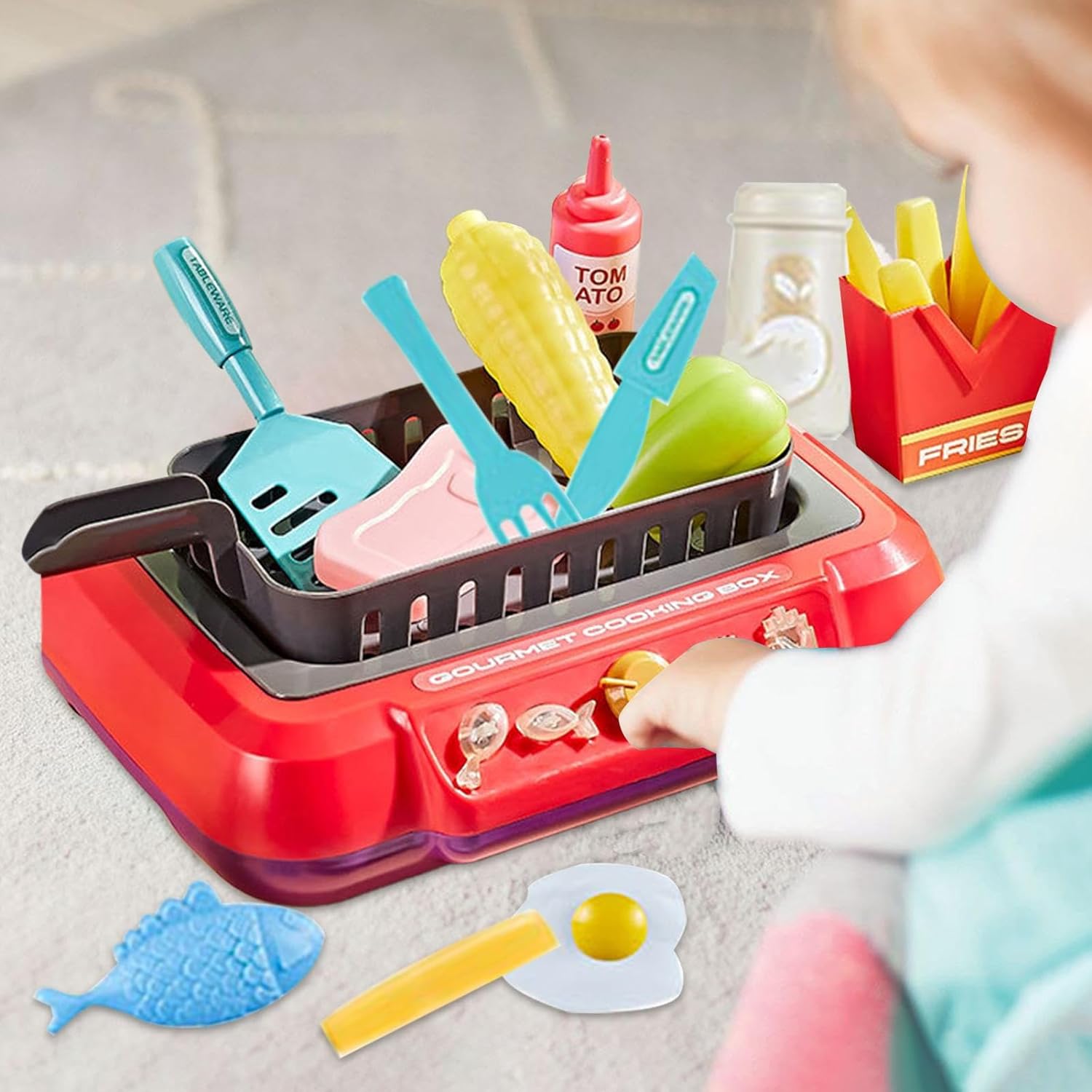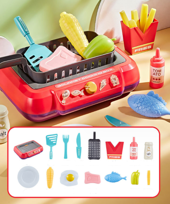 Leiskite savo mažyliams geriau pažinti maisto gaminimo procesą! Tiesiog įpilkite šalto vandens į specialų stalčiuką (vanduo imituoja karštą aliejų) ir uždėkite maistą "ant viryklės". Kuo ilgiau maistas gulės šaltame vandenyje, tuo labiau patamsės (perkeps). Prilietus jį šilta spalva, jis vėl grįš į pradinę spalvą.
