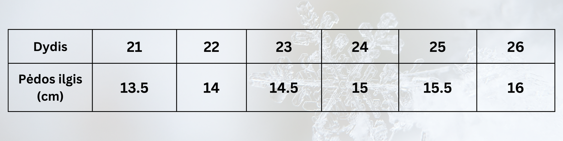 Rekomenduojame rinktis dydį atsižvelgiant į vaiko pėdos ilgį ir pridėti apie 1 cm rezervo. Taip pat remkitės mūsų pateikta dydžių lentele.